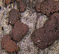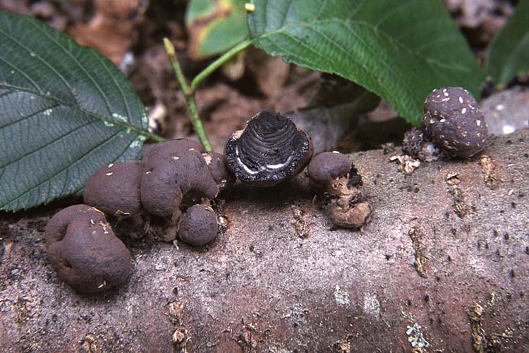Fructification: plus ou moins globuleuse ou en forme de coussin, 1-4 cm, sans pied, à surface inégale, rugueuse, parfois tuberculeuse, brun grisâtre pâle à brun-rouge, devenant noire et un peu luisante avec l'âge.