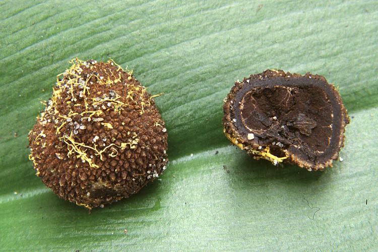 Fructification: globuleuse ou subglobuleuse, 1,5-4 cm de diamètre, entourée d'une pelure épaisse de 1-2 mm, à surface externe brun-jaune puis brun roux, ornée de verrues pyramidales, la pelure vue en section, brune plus ou moins foncée et marbrée de blanchâtre ou de pourpre, du moins dans le jeune âge ; l'intérieur creux au début puis farci de blanc, fonçant ensuite à brun chocolat avec la maturation des spores, tout en devenant compartimenté par des cloisons pâles.