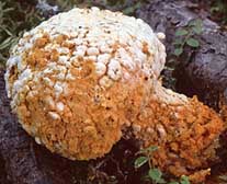 Fructification: ressemblant au début à une moisissure blanche se répandant à la surface du bolet, recouvrant rapidement son hôte en entier, puis devenant pulvérulente et d'un jaune citrin brillant, finalement devenant orangé à rouge-brun bien que ce stade soit moins fréquemment observé. Le bolet parasité devient difforme et sa chair amollit pour finir en une sorte de purée. On distingue les deux stades suivants relativement au développement des organes reproducteurs.