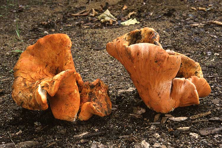 Fructification: ressemblant à une moisissure recouvrant entièrement la surface de son hôte, une russule, d'une couche rugueuse ou pustuleuse, sèche, ferme au touché, orange vif à rouge orangé ou jaune orangé. Le champignon parasité est complètement déformé, sans lames et a souvent l'apparence d'un cône inversé à marge plissée ou tordue; sa chair est blanche, ferme et croustillante.