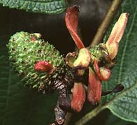 Fructification: infestant les chatons femelles de l'Aulne rugueux et induisant un développement anormal des écailles infectées. Les écailles deviennent déformées en forme de langues sinueuses et tordues, plusieurs fois leur longueur habituelle, passant du vert au rouge vif, puis devenant brunes et noirâtres. Il n'y a pas, à proprement parlé, de véritable fructification puisque le champignon n'est constitué que d'un hyménium formé d'une mince couche d'asques de 30-50 x 10-12 µm, qui recouvre entièrement les écailles infectées ; ce que nous observons ce sont les écailles infectées qui ont été induites à se transformer par le champignon.
