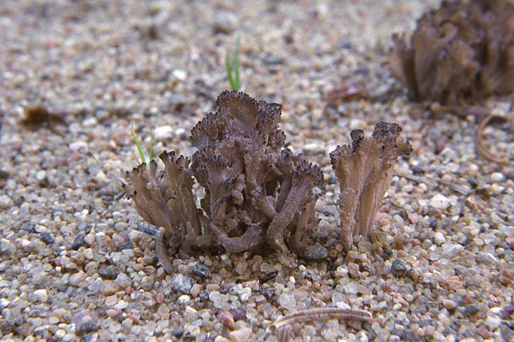 Fructification: coralloïde, 2-7 cm de haut et jusqu’à 5 cm de large, formée de branches isolées ou naissant d’un tronc commun; aux branches lisses ou grumeleuses, parfois un peu sillonnées, plusieurs fois ramifiées vers le sommet, souvent comprimées, blanchâtres à ocracées dans la jeunesse, puis devenant gris-lilas à gris-violet, aux extrémités aiguës ou arrondies; à chair cassante, blanche à grisâtre, à odeur faible et à saveur douce.