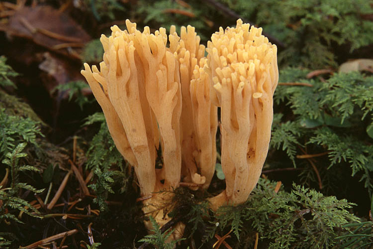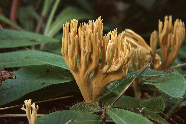 Fructification: coralloïde, 6-12 cm de haut et jusqu’à 12 cm de large, formée d'un tronc robuste, blanchâtre, de 1-4 cm de diamètre, duquel naissent plusieurs branches à leur tour ramifiées ; aux branches un peu ridées longitudinalement, jaune-beige à jaune d'or, ramifiées 2 à 3 fois en U, terminées au sommet par 2 à 4 pointes obtuses, concolores ; à chair blanchâtre, parfois un peu marbrée, à odeur agréable et à saveur douce. Hyphes et basides non bouclées.