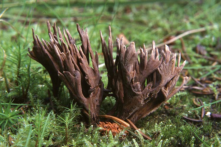 Fructification: coralloïde, arborescente, 3-7 cm de haut et 2-5 cm de large, constituée d'un pied court d'où partent plusieurs rameaux aplatis, lisses, brun pourpré à brun chocolat, aux extrémités palmées, blanchâtres en période de croissance; à chair coriace, brune, à odeur fétide.