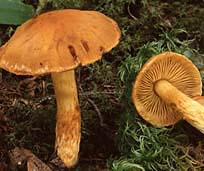 | Sous-genre Cortinarius: Chapeau sec, non hygrophane, aux couleurs vives, souvent feutré, méchuleux ou squamuleux. |