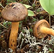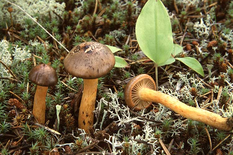 Habitat: Dispersé ou en groupes dans la mousse à caribou (lichen), sous les pins gris, d'août à octobre. Occasionnel