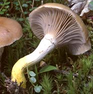 Pied: 4-10 cm de long par 0,7-2 cm de diamètre, habituellement aminci vers la base, plein, un peu fibrilleux, fortement visqueux, blanchâtre au sommet, jaune citron à la base, orné près des lames d'une zone annulaire fibrilleuse, blanche au début, puis noircie par le dépôt des spores.