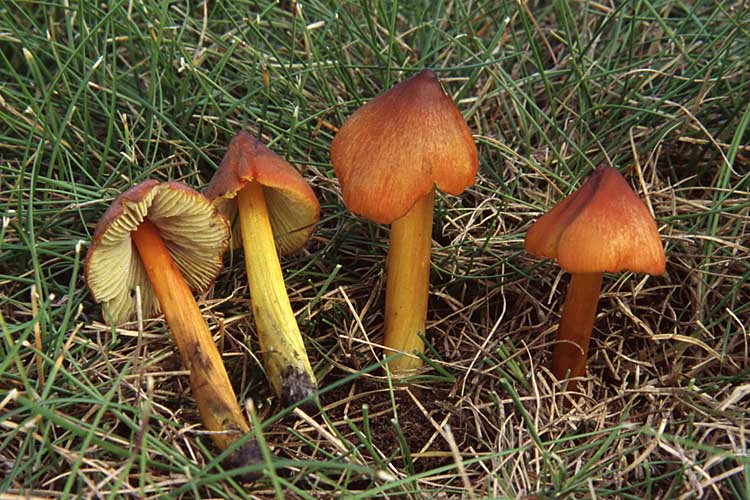 Lames: adnexées à presque libres, larges, assez serrées, épaisses, cireuses, blanchâtres puis jaunes ou jaunâtre orangé, noircissant au froissement.