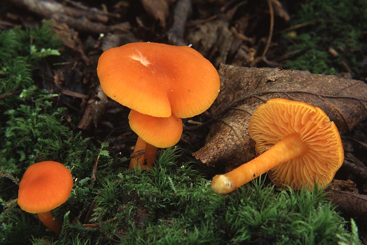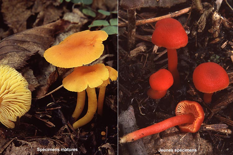 Lames: adnées ou échancrées, larges, espacées, cireuses, orange vif, puis jaune orangé avec l'arête rouge orangé en séchant.