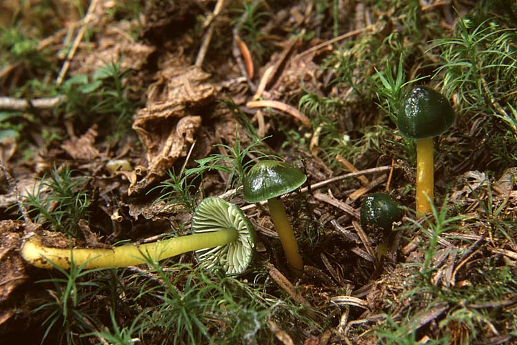 Lames: adnées ou subdécurrentes, larges, subespacées à espacées, épaisses, cireuses, verdâtres au début, puis jaune orangé.