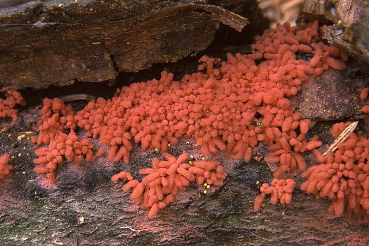 | Les Myxomycètes sont des organismes qui ont la forme d'une masse mucilagineuse et mobile au stade végétatif, et qui se fixent à leur substrat et se transforment en sporanges contenant des spores au stade reproductif, comme de vrais champignons. Strictement parlant les Myxomycètes ne sont pas des champignons. Dans la classification des êtres vivants ils sont plus près des protozoaires que des mycètes, mais comme traditionnellement ils ont été étudiés par les mycologues je continue ici cette tradition. |