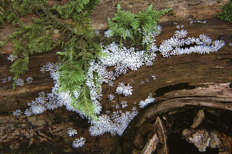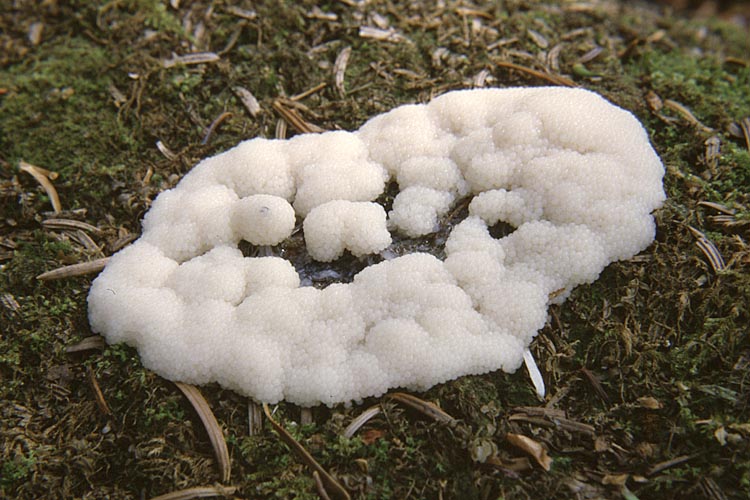 Champignon: formant des colonies de petits bâtons dressés, très fragiles, souvent courbés, de quelques millimètres de haut (var. fruticulosa), ou encore formant de petits buissons poreux, 2-10 mm de haut, très fragiles, en forme de nids d'abeilles ou de coraux (var. poroides), habituellement blancs mais parfois gris, jaunes ou jaune-vert, apparaissant flous par la présence des spores formées sur la surface.