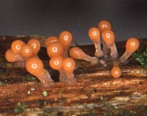 Champignon: formant des sporanges à maturité; sporange 1-3 mm de haut, constitué d'une tête globuleuse ou presque, jaune orangé, rouge orangé ou même brun chocolat, montée sur un pied carné, 0,5-2 mm de long. A maturité la tête perd son enveloppe (péridium) exposant alors l'intérieur constitué d'une touffe cotonneuse-filamenteuse jaune; de l'enveloppe ne persiste qu'une coupe à la base de cette touffe. En même temps le pied se dessèche, devient plus fin et prend une teinte rouge-brun foncé.