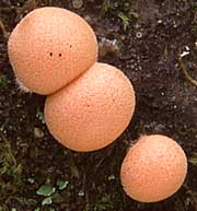 Champignon: ressemblant dans la jeunesse à de petites vesses-de-loup globuleuses ou réniformes, 0,3-1,0 cm de diamètre, roses ou saumon, à surface pustuleuse, avec l'intérieur rempli d'une pâte plus ou moins liquide et concolore à la surface. En vieillissant les fructifications deviennent violacées, puis brun grisâtre et finalement noirâtres; l'enveloppe devient sèche, mince et de la consistance du papier, en même temps la masse des spores contenue à l'intérieur devient ocre, puis cendrée et poudreuse comme chez les vesses-de-loup.