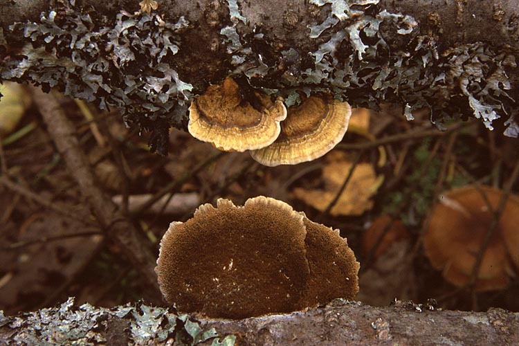 Carpophore: annuel, sessile en forme de console ou encore presque circulaire avec un pied latéral rudimentaire, parfois même avec un pied central court lorsque sur le sol au pied de l'arbre, 3-10 cm de large ou de diamètre, 0,5-1,5 cm d'épaisseur; à chair brun-jaune, jusqu'à 1 cm d'épaisseur, à structure double, molle et spongieuse dans la partie supérieure, ferme et subéreuse près des tubes.