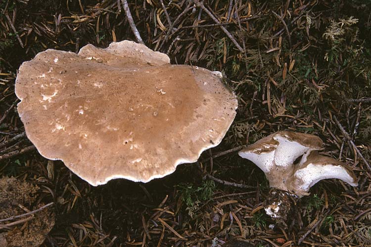 Carpophore: annuel, 4-25 cm de large, 2-6 cm d'épais, convexe ou ongulé, presque rond ou réniforme; à chair tenace, caoutchouteuse, 1-3,5 cm d'épaisseur, blanche, à odeur forte et à saveur un peu amère.