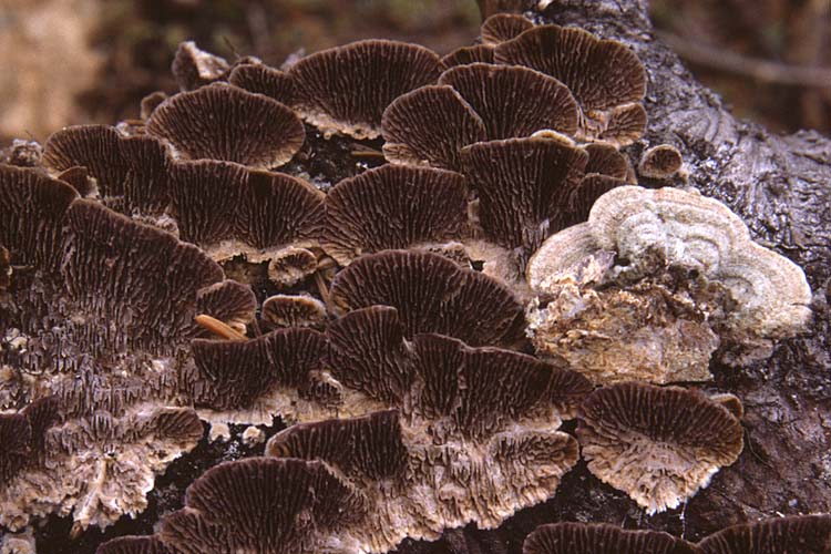 Habitat: En troupes nombreuses disposées en rangées superposées ou imbriquées, les individus souvent fusionnés latéralement, ou bien en rosette sur le dessus des branches et des troncs tombés de feuillus morts, parfois d'arbres vivants blessés, d'août à octobre. Commun