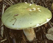 Chapeau: 4-9 cm de diamètre, convexe, puis étalé et un peu déprimé au centre; à surface lisse, viscidule si humide, plus ou moins luisante au sec, vert terne à vert grisâtre, vert olive ou jaune-vert, parfois tachée de jaune, à cuticule séparable jusqu'à mi-rayon; à marge largement arrondie, souvent un peu sillonnée avec l'âge; à chair épaisse, ferme, blanche, modérément saumon au FeSO4, à odeur faible et à saveur douce.