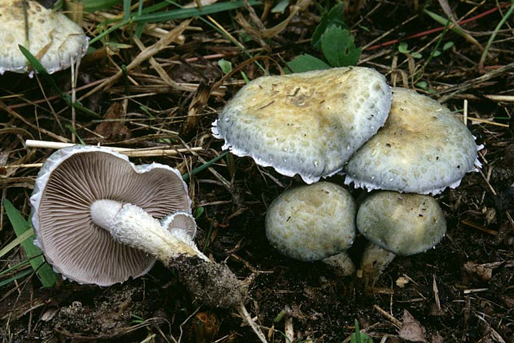 Lames: adnées ou décurrentes en filet, larges, serrées à subespacées, crème au début, puis jaune-gris pâle, finalement grises de plus en plus foncées et souvent avec une nuance violacée, jaune pâle à l'arête.