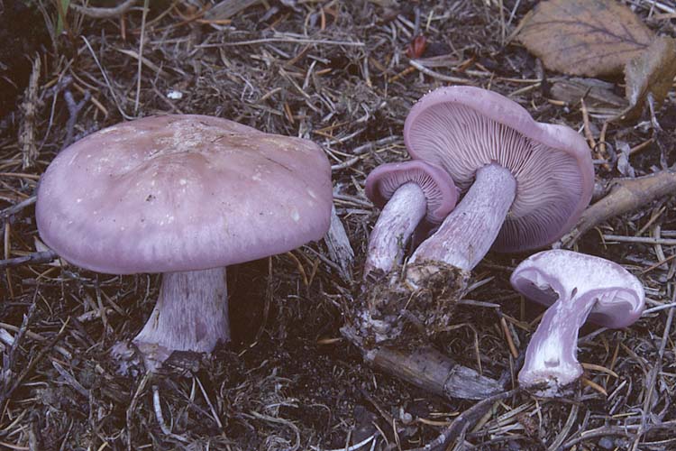 Lames: adnées à échancrées, assez étroites, serrées, à lamellules intercalées, lavande, lilas bleuté ou violettes au début, développant une teinte brunâtre avec l'âge.