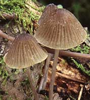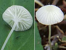 Commentaire: Les deux séries de mesures de spores proviennent de spécimens de deux récoltes différentes ; l'un (15 octobre 2003) avait des basides tétrasporées et l'autre (7 juillet 2004) des basides bisporées. Le (?) à droite de Synomymes signifie que je ne suis pas entièrement convaincu que Mycena delicatella soit la même espèce que le Mycena lactea des auteurs européens.