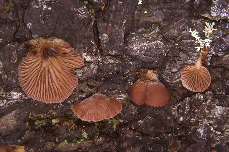 Chapeau: 0,6-1,8 cm, convexe, pendant d'un point d'attache situé sur le dessus du chapeau; à surface glabre près de la marge, ailleurs couverte d'une pruine blanche devenant de plus en plus abondante à l'approche du point d'attache, sur fond brun vineux à brun beige; à marge plissée, striée par transparence jusqu'au tiers ou à la moitié du rayon; à chair très mince, tenace, blanchâtre ou concolore, sans odeur ni saveur particulière.