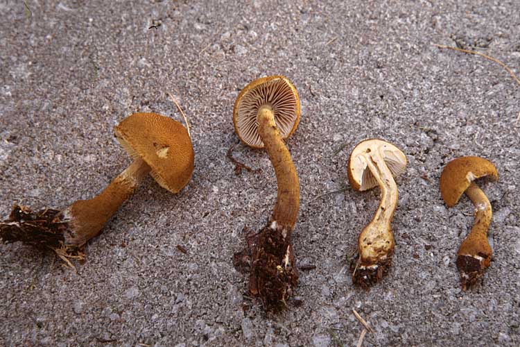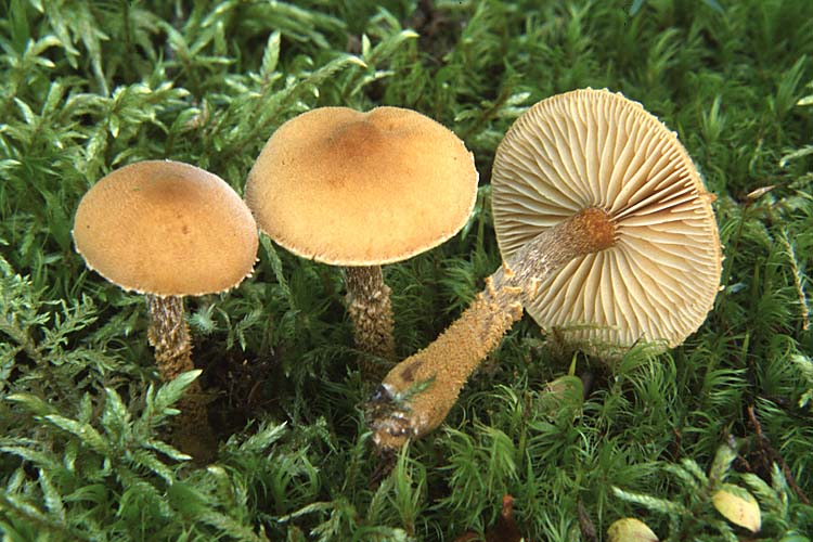 Pied: 2-5 cm de long par 3-5 mm de diamètre, égal ou un peu élargi vers la base, parfois bulbeux, farci puis creux, crème poudré de blanc au-dessus de l'anneau, guêtré en dessous et jusqu'à la base de fibrilles blanchâtres et de mèches orangées sur fond brunâtre.