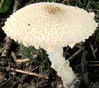 Chapeau: 4-10 cm de diamètre, presque globuleux au début et un peu écrasé sur le dessus, puis convexe et finalement presque étalé; à surface sèche, lisse, soyeuse et blanche dans la jeunesse, puis s'ornant avec l'âge de grosses squames apprimées plus ou moins brunâtres sur fond blanchâtre; à marge longtemps infléchie, prolongée ou appendiculée de restes du voile; à chair épaisse, ferme, blanche, rosâtre sous la cuticule, rosissant un peu à la coupe, à odeur et saveur douces et agréables.