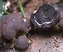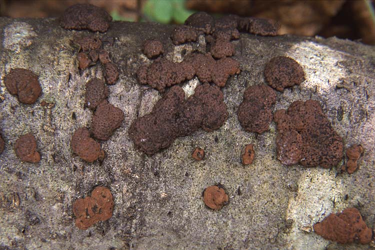 Fructification: plus ou moins globuleuse ou en forme de coussin, 1-4 cm, sans pied, à surface inégale, rugueuse, parfois tuberculeuse, brun grisâtre pâle à brun-rouge, devenant noire et un peu luisante avec l'âge.
