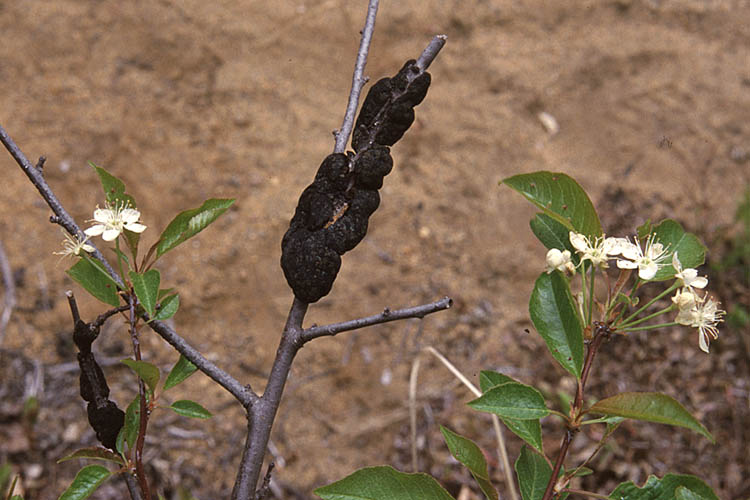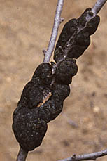 Fructification: Nodules ou renflements noirs, 5-25 cm de long par 2-5 cm de diamètre. La première année il n'y a qu'un renflement vert olivâtre le long d'une branche, l'année suivante apparaissent les nodules noirs dont la surface granuleuse se fendille peu à peu. Les branches affectées meurent rapidement et les gros nodules noires persistent sur les branches mortes jusqu'à ce que celles-ci finissent par se briser et tomber.