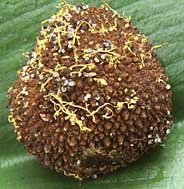 Stade parfait: La fructification est alors constituée d'un tissu orangé à rouge-brun contenant de petites cavités globuleuses (périthèces) tapissées d'asques cylindriques à 8 spores; aux spores fusiformes, verruqueuses, hyalines, 1-septées, 25-30 x 5-6 µm.