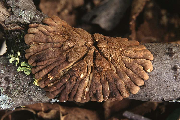 Fructification: 5-10 cm de diamètre, formée de doigts ou de lobes cylindriques, clavés ou de section irrégulière, 1-3 cm de long par 2-4 mm de diamètre, rayonnant en étoile à la surface du substrat, brun-beige, devenant parfois brun-rouge vers le centre avec l'âge; à surface rugueuse, plissée par endroits, bosselée ailleurs, devenant piquée par les minuscules ouvertures noirâtres (ostioles) des petites cavités fertiles (périthèces) qui se forment sous la surface; à chair pâle, dure, fibreuse.