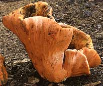Fructification: ressemblant à une moisissure recouvrant entièrement la surface de son hôte, une russule, d'une couche rugueuse ou pustuleuse, sèche, ferme au touché, orange vif à rouge orangé ou jaune orangé. Le champignon parasité est complètement déformé, sans lames et a souvent l'apparence d'un cône inversé à marge plissée ou tordue; sa chair est blanche, ferme et croustillante.