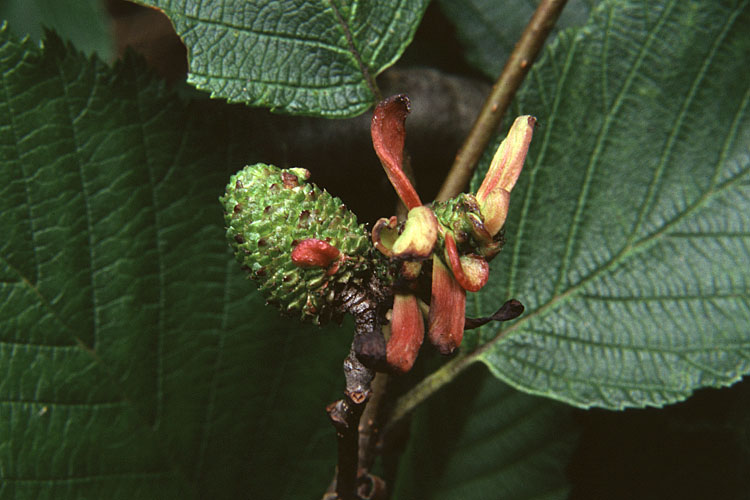 Fructification: infestant les chatons femelles de l'Aulne rugueux et induisant un développement anormal des écailles infectées. Les écailles deviennent déformées en forme de langues sinueuses et tordues, plusieurs fois leur longueur habituelle, passant du vert au rouge vif, puis devenant brunes et noirâtres. Il n'y a pas, à proprement parlé, de véritable fructification puisque le champignon n'est constitué que d'un hyménium formé d'une mince couche d'asques de 30-50 x 10-12 µm, qui recouvre entièrement les écailles infectées ; ce que nous observons ce sont les écailles infectées qui ont été induites à se transformer par le champignon.