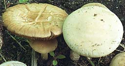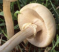 Lames: adnées ou un peu décurrentes par une dent, serrées, d'abord blanchâtres-grisâtres, puis brunes avec l'âge.