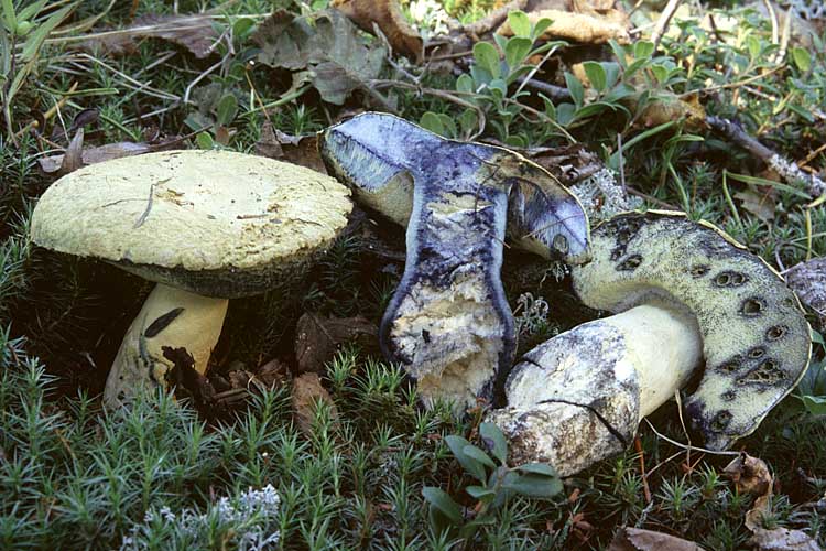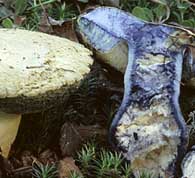Tubes: adnées, devenant déprimés autour du pied, blanchâtres au début puis jaunissant avec l'âge, bleuissant rapidement à la coupe; aux pores concolores, petits et ronds, environ 2 par mm, bleuissant rapidement au froissement.