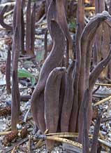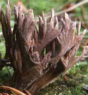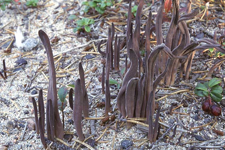 Fructification: élancée, non ramifiée, 3-10 cm de haut, 0,2-0,8 cm de diamètre, cylindrique à fusiforme, plus ou moins comprimée ou sillonnée, au sommet atténué en pointe aiguë ou arrondie, à surface glabre, brun-pourpre grisâtre à pourpre noirâtre, brunâtre à la base, au pied peu distinct; à chair fragile, blanchâtre à lilas foncé, à odeur faible et à saveur douce.