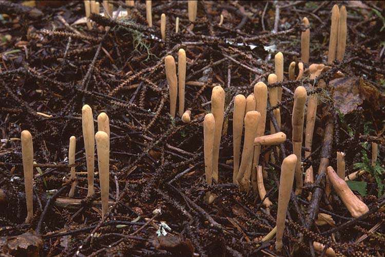 Fructification: en forme de massue ou presque cylindrique, 2,5-12 cm de haut, 0,4-2 cm de diamètre, de section ronde ou un peu comprimée, au sommet arrondi ou aplati ; à surface lisse ou plissée-cannelée longitudinalement, ocre terne à jaune brunâtre ou brun rosâtre pâle, la partie inférieure développant une teinte ocre cendré-rosé avec l'âge, orné à la base de mycélium blanc; à chair spongieuse, blanche.
