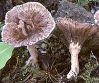 Chapeau: 1,5-4 cm de diamètre, en entonnoir avec des lobes en forme de pétales à l'intérieur, fendu sur le côté à certains endroits; à surface striée-plissée radialement, plus ou moins zonée, brun pourpré à brun jaunâtre; à marge blanchâtre, entière ou lacérée; à face inférieure fertile, lisse, plissée, gris-brun, gris pâle à la marge; à chair coriace, à odeur forte, un peu désagréable.