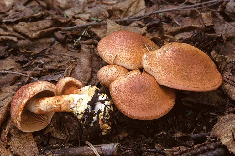 Pied: 3-7 cm de long par 0,5-1,5 cm de diamètre, égal, parfois un peu bulbeux à la base, plein puis creux, couvert ou chiné de méchules ou d'écailles rouge brique sur fond blanchâtre ou jaunâtre, jaunissant au froissement.