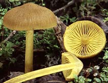 Lames: adnées à sinuées, serrées, jaunes au début puis jaune brunâtre, brun-jaune rouille à la fin.