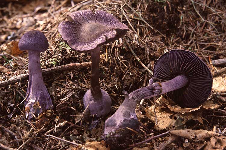 Lames: adnées et décurrentes par un filet au début, devenant par la suite échancrées, larges, serrées à subespacées, violettes au début, puis violet noirâtre, finalement brun sordide, à arête violet pâle.