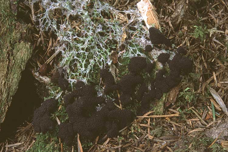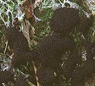 Champignon: formant de petites fructifications (sporanges) bleu-gris, subglobuleuses, 0,3-0,5 mm de diamètre, sans pied, constituées d'une enveloppe calcaire (le péridium) et, à l'intérieur, de la masse brun pourpré des spores.