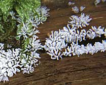 Champignon: formant des colonies de petits bâtons dressés, très fragiles, souvent courbés, de quelques millimètres de haut (var. fruticulosa), ou encore formant de petits buissons poreux, 2-10 mm de haut, très fragiles, en forme de nids d'abeilles ou de coraux (var. poroides), habituellement blancs mais parfois gris, jaunes ou jaune-vert, apparaissant flous par la présence des spores formées sur la surface.