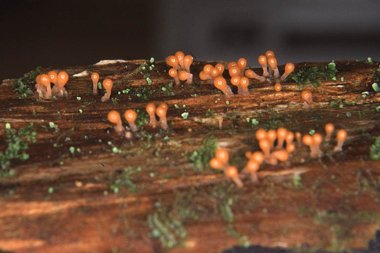 Champignon: formant des sporanges à maturité; sporange 1-3 mm de haut, constitué d'une tête globuleuse ou presque, jaune orangé, rouge orangé ou même brun chocolat, montée sur un pied carné, 0,5-2 mm de long. A maturité la tête perd son enveloppe (péridium) exposant alors l'intérieur constitué d'une touffe cotonneuse-filamenteuse jaune; de l'enveloppe ne persiste qu'une coupe à la base de cette touffe. En même temps le pied se dessèche, devient plus fin et prend une teinte rouge-brun foncé.