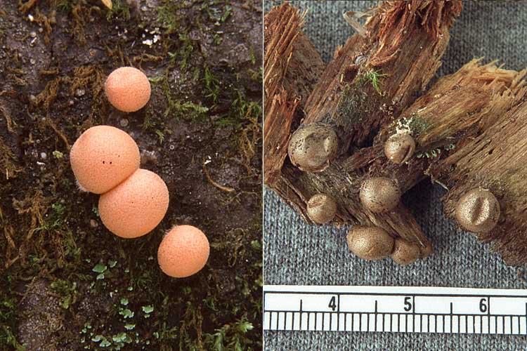 Champignon: ressemblant dans la jeunesse à de petites vesses-de-loup globuleuses ou réniformes, 0,3-1,0 cm de diamètre, roses ou saumon, à surface pustuleuse, avec l'intérieur rempli d'une pâte plus ou moins liquide et concolore à la surface. En vieillissant les fructifications deviennent violacées, puis brun grisâtre et finalement noirâtres; l'enveloppe devient sèche, mince et de la consistance du papier, en même temps la masse des spores contenue à l'intérieur devient ocre, puis cendrée et poudreuse comme chez les vesses-de-loup.