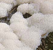 Commentaire: Sur l'image de droite de la grosse photo, la croûte calcaire superficielle est partie sur le dessus et on y aperçoit la masse brun foncé des spores.