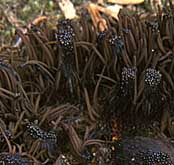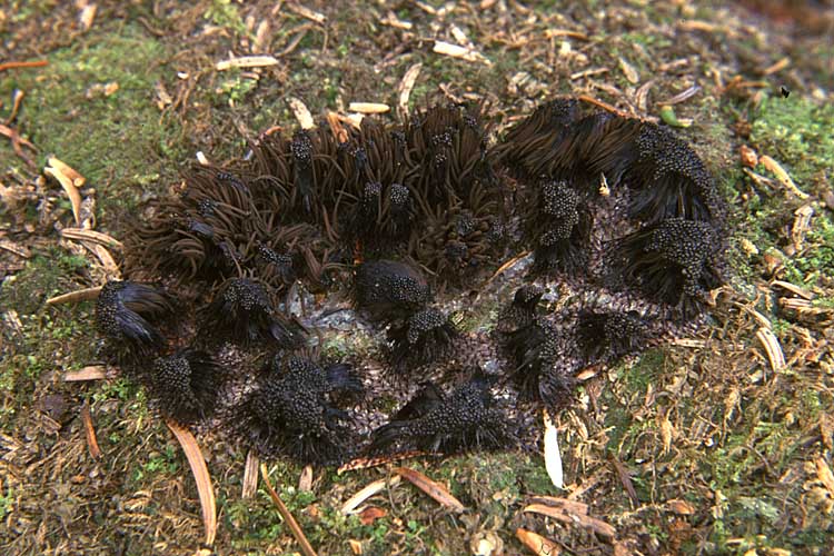 Fructification: composée d'une colonie de petits sporanges, chaque sporange 2-6 mm de haut et 0,5-1,2 mm de diamètre, constitué d'une tête ovoïde ou courtement cylindrique, cotonneuse-filamenteuse, rouge-brun rosé à rouge brique, montée sur un pied très fin, concolore ou noirâtre, 0,5-1,5 mm de long, issu d'une petite plaque (l'hypothallus) mince, circulaire, étalée sur le substrat.