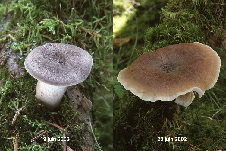 Chapeau: 4-20 cm de large, convexe puis déprimé ou en entonnoir; à surface lisse, habituellement non zonée mais parfois oui, brun rougeâtre avec le centre brun noirâtre à brun pourpré, plus claire ou ocracée vers la marge, jamais gris même dans le jeune âge ; à marge mince, parfois lobée, ondulée avec l'âge; à chair mince, coriace, blanche puis brunâtre.