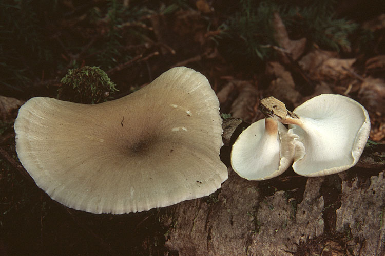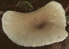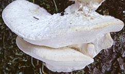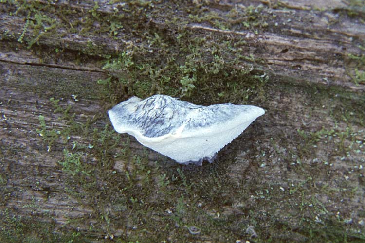 Carpophore: annuel, sans pied, en forme de console, largement fixé au substrat, 1-6 cm de large, 1-4 cm de projection et 0,5-1,5 cm d'épaisseur au point d'attache; à chair tendre puis bientôt tenace, blanche, grisâtre ou jaunâtre avec l'âge.